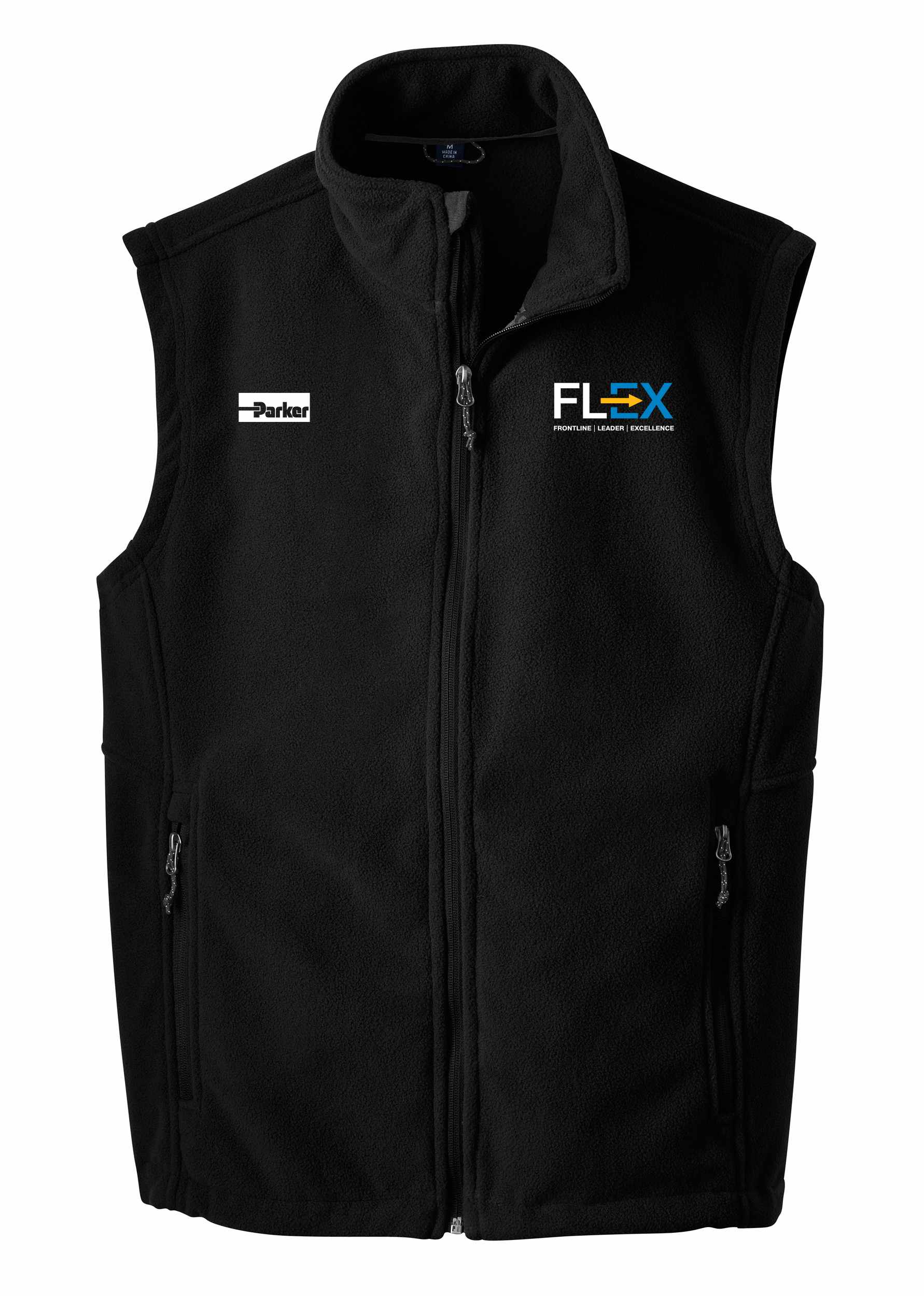 FLEX/Parker vest decorated with embroidered logos on both left and right chest.